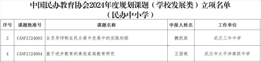 经武汉市民办中小学幼儿园协会推送,武汉三牛中学、武汉市太平洋高级中学各自提交的课题,成功获得中国民办教育协会2024年度的立项课题,可喜可贺!