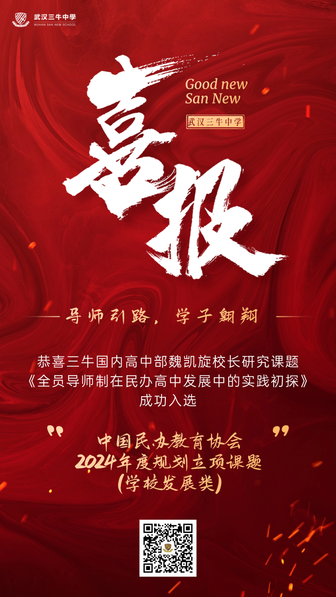 热烈庆祝武汉三牛中学国内高中部魏凯旋校长研究课题《全员导师制在民办高中发展中的实践初探》成功入选中国民办教育协会2024年度规划立项课题(学校发展类),成为唯二入选该名单的武汉市民办学校之一!