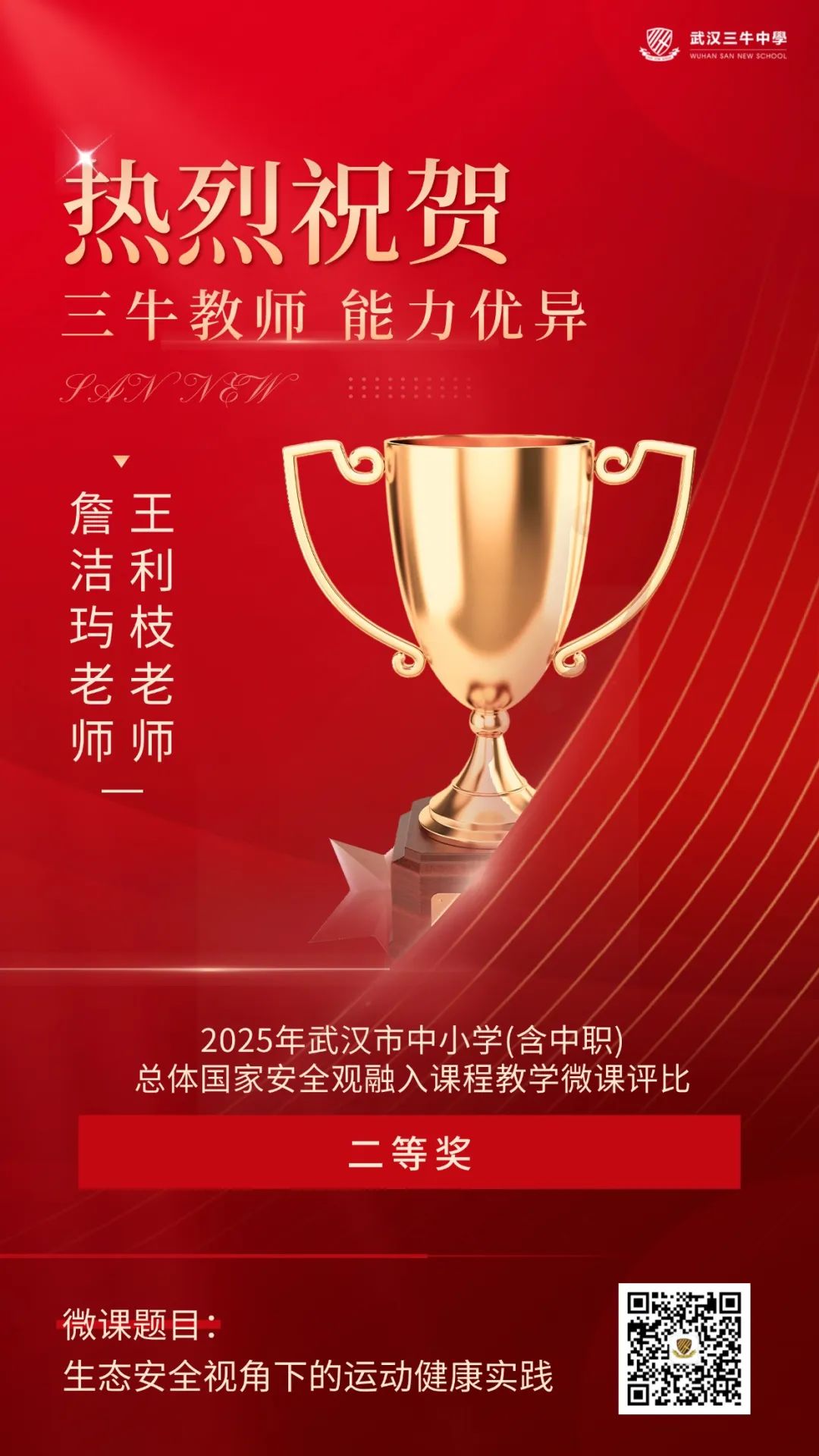二等奖!祝贺三牛教师团队喜获2025年武汉市中小学(含中职)总体国家安全观融入课程教学微课评比佳绩