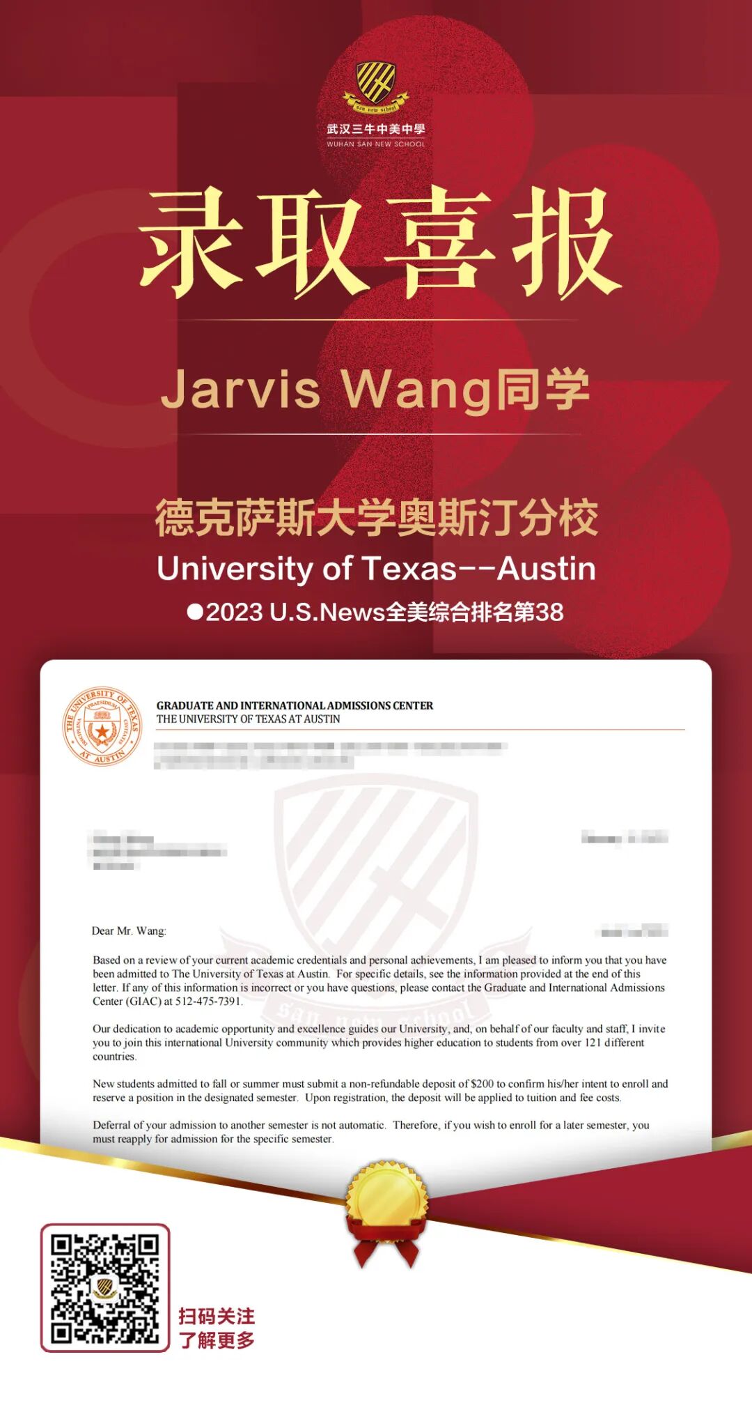 ![]() ![]() 德克萨斯大学奥斯汀分校 2023 U.S.News全美综合大学排名第38 得克萨斯大学奥斯汀分校(University of Texas at Austin)创建于1883年,是得克萨斯大学系统的旗舰校区,是一所顶尖公立研究型大学,“公立常春藤”之一。得克萨斯大学系统是全美受捐赠数额第二大的教育机构,累计超过310亿美元,仅次于哈佛大学。截至2019年10月,UT-Austin的历届校友中,产生了13位诺贝尔奖、2位图灵奖、18位普利策奖得主。 ![]() ![]() ![]() 再次祝贺 Jarvis Wang同学 在2023届海外大学录取中取得的优秀成绩 *感谢武汉三牛升学指导中心老师对本文提供的信息支持。 2023-02-06 2023-01-09 2023-01-03 2022-12-22 2022-12-16 2022-11-18 2022-11-11