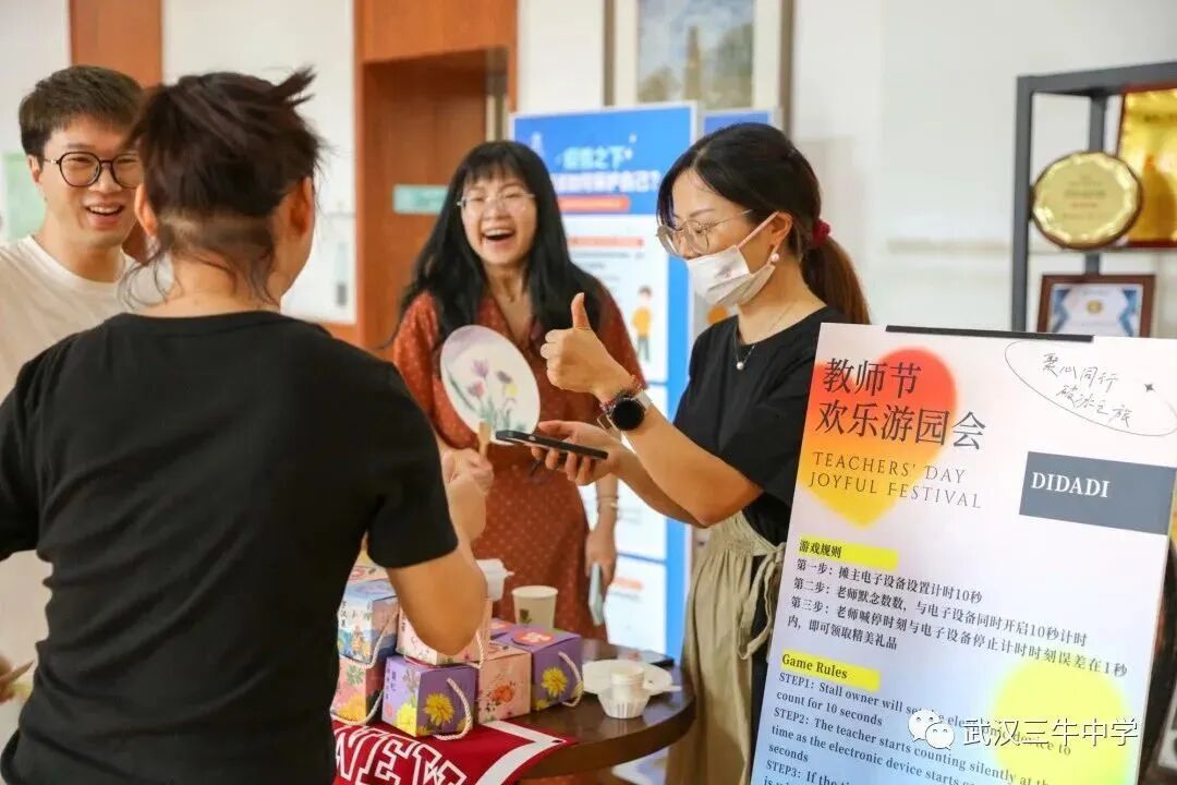 打开教师节的新方式?欢乐游园会,三牛师生同聚同乐在第三十九个教师节到来之际,我们暂时收起对教师职业宏大的赞扬和歌颂,想透过一些有趣的互动、有心的举动,去贴近真实具体的人,去聚拢同样心怀教育理想的前行者。 ![]() 因为我们深知,没有各位优秀中青年教师的加入,就没有三牛大家庭的现在,更没有三牛学子的未来。 今年的教师节,我们只有一个朴素的愿望:想和老师们在一起,热热闹闹,开开心心的过这个节。像朋友一样,像亲人一样。 9月8日下午13点,三牛教师节特别活动在教学楼二楼大厅举行,收到邀请的老师们利用下课时间,相继赶来参赴这场欢乐之旅。 ![]() 活动现场,学校精心准备了多个区域——甜品台、有奖游戏区、解压手工区和爱眼检查区,为老师们提供了丰富多彩的活动形式。 拉近彼此关系也好,卸下工作疲惫也好,重要的是,此刻放松心情,日后同心同行。