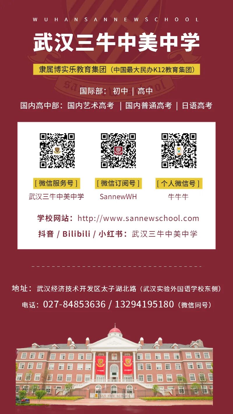 ![]() 文案 | G8涂怡然/G10王晓艺/G11周延溪/ G12胡枫清扬/G12窦冲/G12赵杨 排版 | G11周延溪 图片 | G11谢汉潇 / Ms.Emily 三牛新闻社的核心工作是撰写公众号文章,且文章的重心是我校学生的校园生活和一些有趣的节日、比赛、活动,新闻社的每一位成员都致力于传播多彩的校园文化。如果想了解我们更多,您可以进入三牛中美中学官方微信公众号,点击菜单栏【走进三牛-SAN NEWS】,就可以找到我们啦! SAN NEWS is brought to you by the Journalism Club at San New High School in Wuhan, China! You can find us by going to the official San New School WeChat account and by clicking [家校互动-SAN NEWS] at the bottom right.